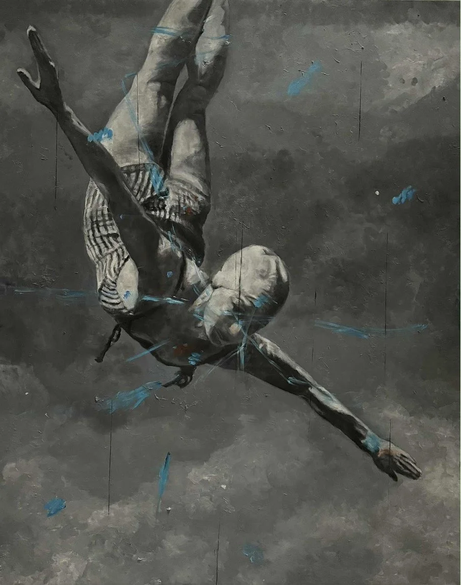 In the painting “Untitled III (after L.R.)”, the artist is intrigued by the director and photographer’s ability to merge documentary realism with glorifying idealization. He focuses on a moment captured by Riefenstahl’s camera—a slow-motion dive into water—which intensifies the dramatic tension of the scene. The swimmer’s body glides through the air with astonishing momentum. At the same time, the restriction to a grey monochrome palette in the large-scale painting creates the impression of a fading photograph or a dimming screen. Subtle variations of grey tones and restless flashes of blue evoke a sense of transience and disappearance.