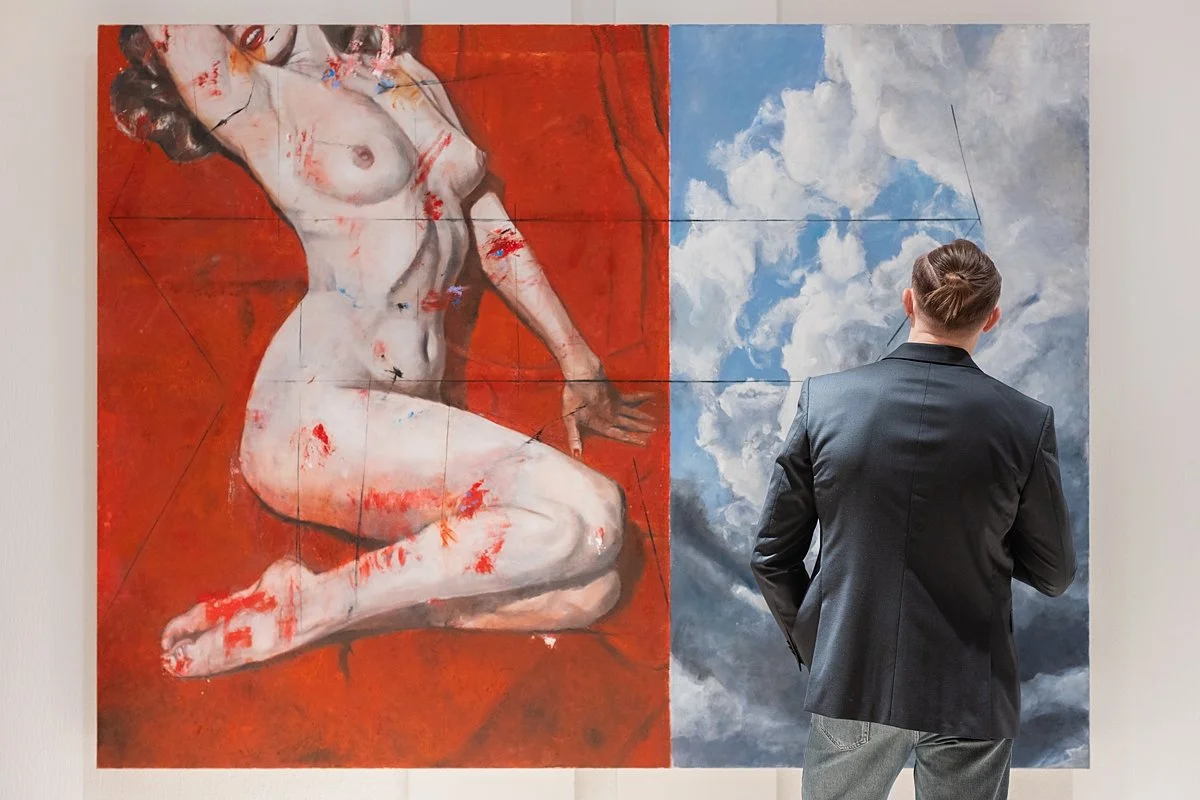 Paukštelis is drawn to the cultural multiplicity and ambiguity of themes and motifs. These qualities are also evident in his painting “Olympia (after T. Kelley)”. The starting point for this work was a nude photograph of Marilyn Monroe taken in 1949 by American Hollywood celebrity photographer Tom Kelley. According to Monroe’s recollections, she posed for a fee of 50 dollars at a time when she was struggling financially and even starving. The photograph was first published in a mass-produced calendar and became wildly popular. In it, the actress poses in a provocatively erotic position. Working from this photograph, the painter further intensifies its provocative nature. The vivid red fabric background accentuates the silhouette of the body while simultaneously creating a sense of vulnerability. Red reflections on the woman’s body evoke associations with bloody scratches. Yet above all, she remains a desired subject-object. As a contrast to this image, a realistic landscape of rain-laden clouds is symmetrically composed on the other side of the painting. This unusual iconography provokes a mixture of thoughts and emotions. By borrowing Kelley’s photographic reference, Paukštelis places it into a new context, extending the provocation of Édouard Manet’s painting “Olympia,” which broke away from the idealized tradition of the female nude. In these latest works, as in his earlier oeuvre, Paukštelis continues to balance between past and present, tradition and innovation.